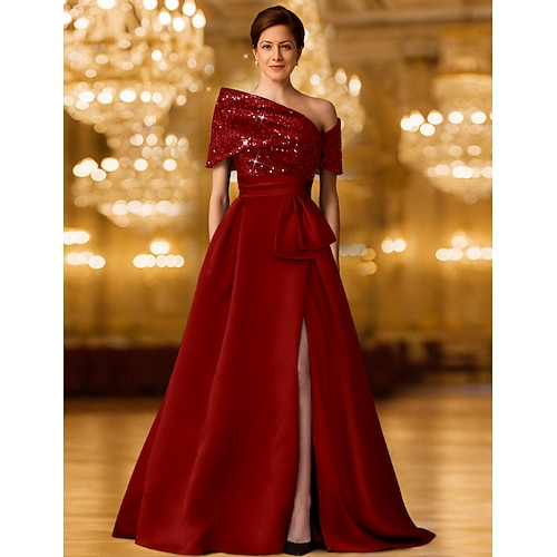 Linea ad A Lunghezza al pavimento Abito da Sera Da principessa Abito formale Elegante Scintillante Setoso Manica Lunga Monospalla Matrimonio Formale Tasca Raso Elasticizzato con Glitter