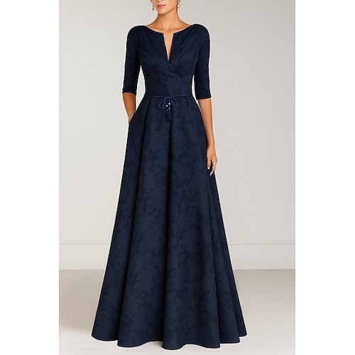 Linea ad A Lunghezza al pavimento Abito da invitata a nozze Abito Formale Abito svasato Abito da cerimonia per signora Mezza Manica Scollo a V Elegante Vintage Matrimonio Formale con Fiocco/Fiocchi