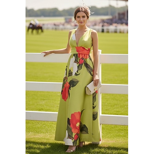 Linea ad A Lunghezza al pavimento Abito da invitata a nozze Abito Formale Abito Derby Abito da cerimonia per signora Senza Maniche Scollo a V Elegante Formale Ferie Derby del Kentucky Raso con Fascia