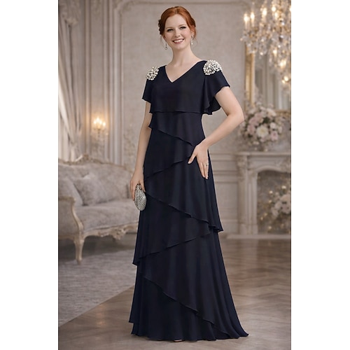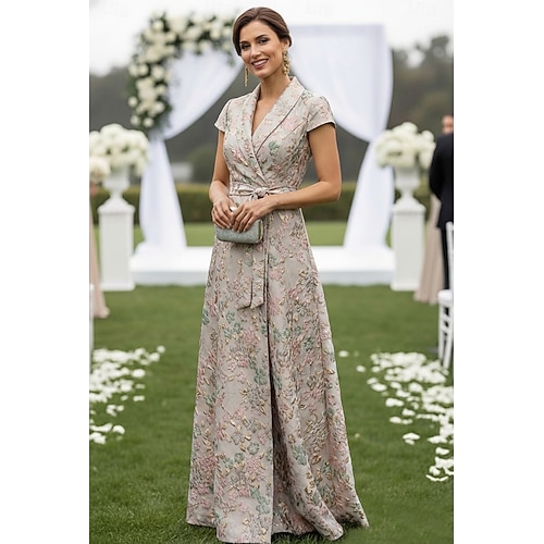 Linea ad A Abito Lunghezza al pavimento Abito da invitata a nozze Abito da sera Abito da cerimonia per signora Manica Corta Scollo a V Elegante Semplice Casual Formale Ospite di nozze Derby del