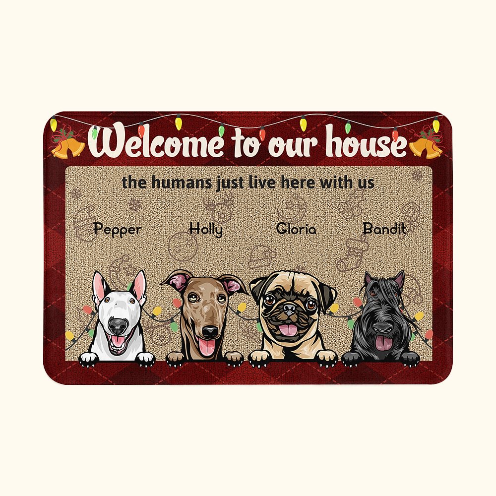 Tapis de porte personnalisé The Humans Just Live Here With Us Cadeau de Noël Cadeau d'anniversaire pour les amoureux des animaux de compagnie