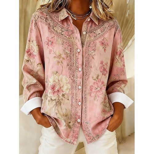 Per donna Camicia Floreale Bohemien Vintage Casual Manica Lunga Colletto a Camicia Top Regolari Quotidiano Bottoni Stampato Rosa Primavera Autunno Inverno