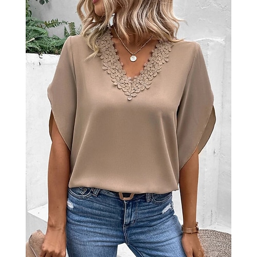 Per donna Blusa Tinta unica Elegante Essenziale Casual Manica 3/4 Scollo a V Top Regolari Quotidiano Arricciato Bordo in pizzo Nero Bianco Rosa Blu marino Verde Estate Primavera