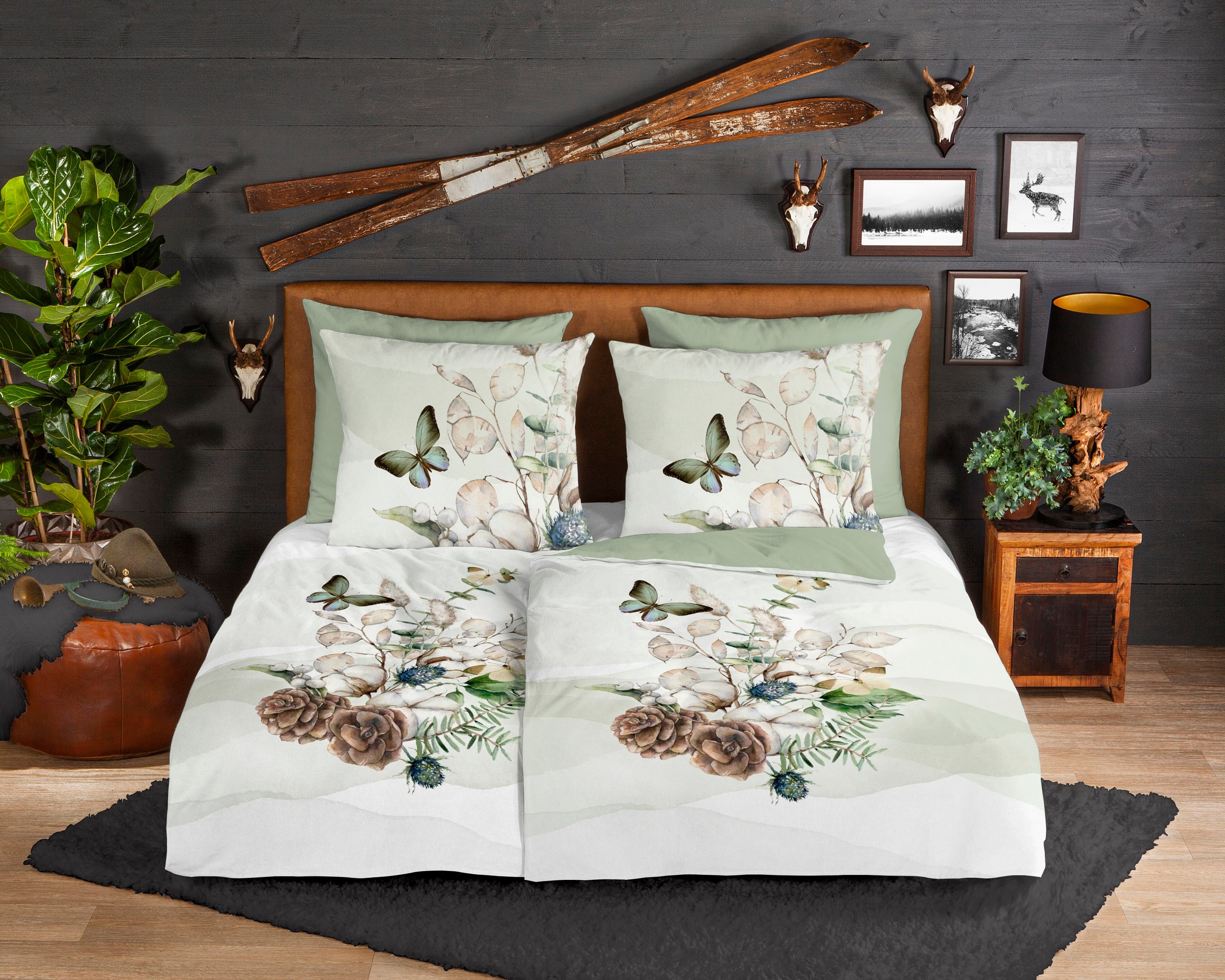 Wendebettwäsche GOOD MORNING "Feathers", weiß (weiß, beige), B/L: 135cm x 200cm, 1 Stk., 1 Stk., Flanell, B/L: 80cm x 80cm, 2 Stk., Flanell, Obermaterial: 100% Baumwolle, Bettwäsche, Wendebettwäsche, Biber, 135x200, Warm, Weich, Wendeoptik, Reißverschluss