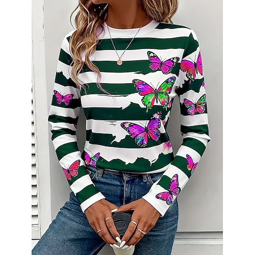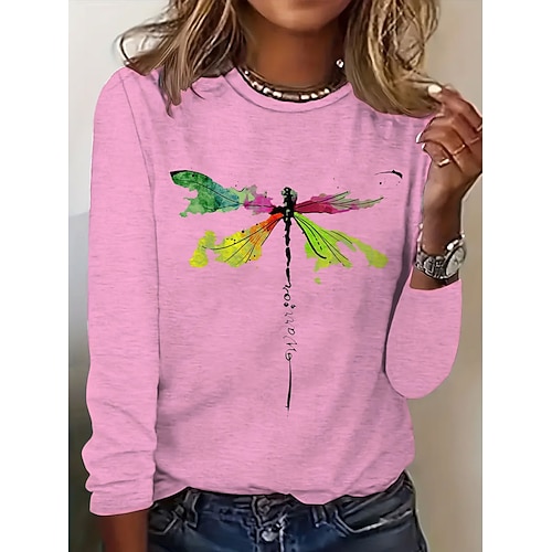 Per donna Maglietta Grafico Libellula Vintage Elegante Classico Manica Lunga Girocollo Top Regolari Quotidiano Stampato Rosa Blu Verde Primavera Autunno Inverno