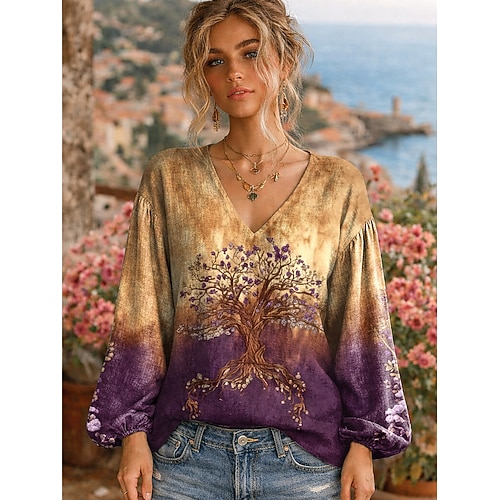Per donna Maglietta Grafico Farfalla Vintage Elegante Casual Manica Lunga Scollo a V Top Regolari Quotidiano Stampato Blu Viola Arancione Verde Primavera Autunno