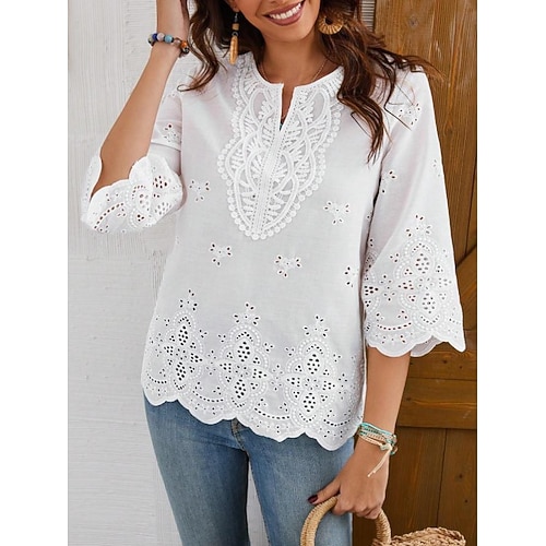 Per donna Blusa Tinta unica Elegante Casual Manica 3/4 Scollo a V Top Regolari Quotidiano Pizzo Nero Bianco Estate Primavera Autunno