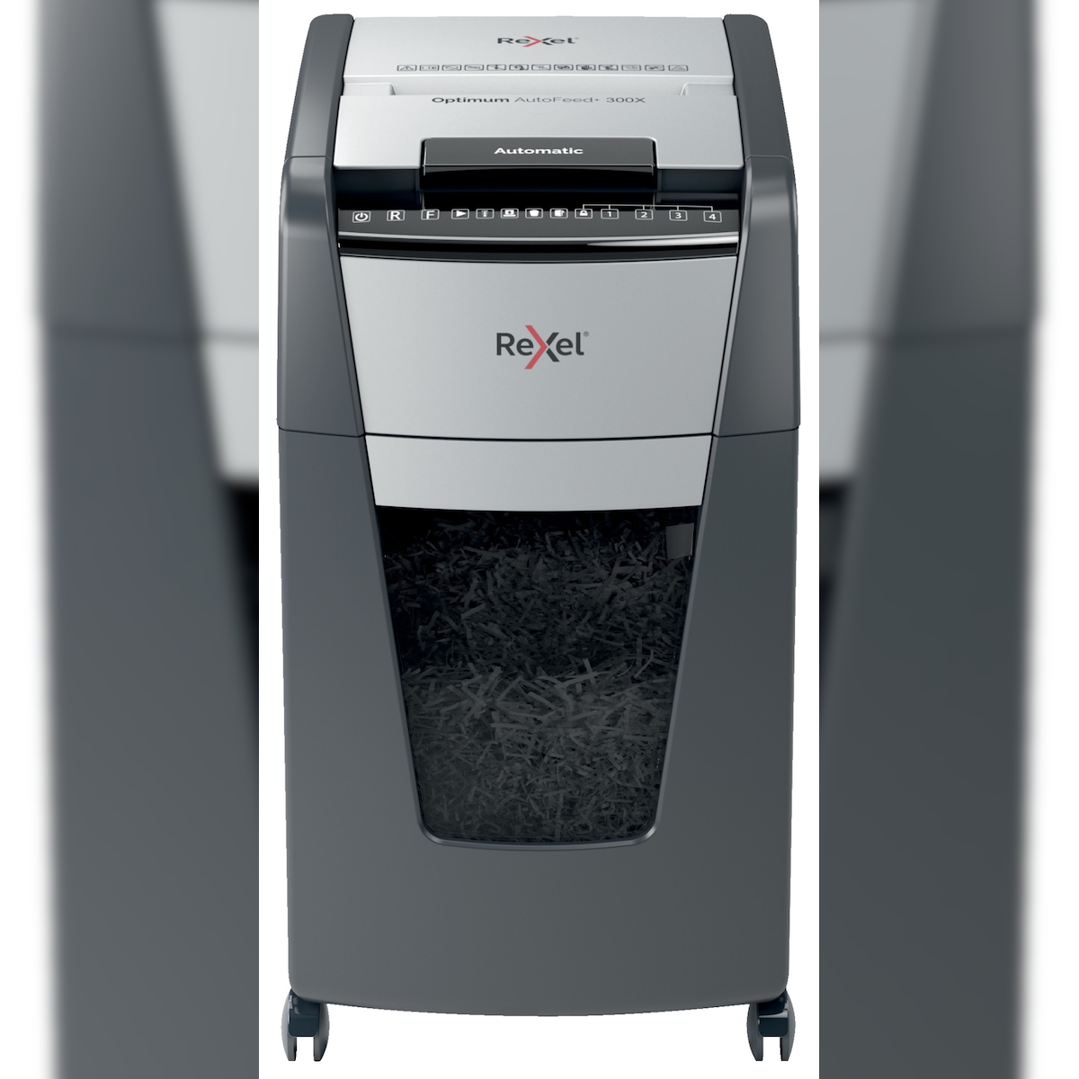 Rexel 2020300X Auto+ 300X — Automatischer P4-Sicherheits-Aktenvernichter mit Querschnitt, Fassungsvermögen 300 Blatt, herausnehmbarer 60-Liter