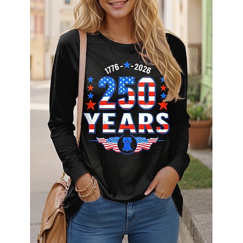 T-Shirt per la Festa dell'Indipendenza Americana 250° per Donne Grafica Bandiera Stilosa Casual Manica Lunga Girocollo Top Regolari Stampa Giornaliera Blu Nera Primavera Autunno