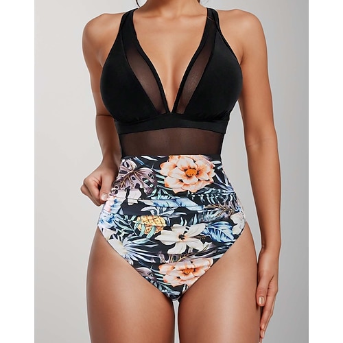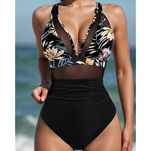 Per donna Costume da bagno con stampa floreale One Piece Costume da bagno a vita alta con volant Tinta unita Elastico Senza Maniche Costume da Bagno Surf Snorkeling Nuoto Estate