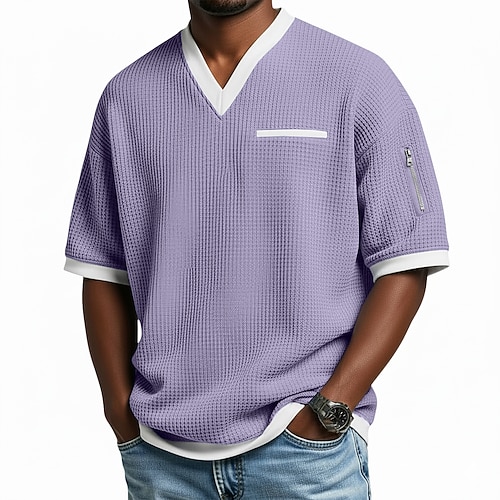 Per uomo Maglietta a Maglia Waffle Maglietta Manica Corta Scollo a V Estate Testurizzato Moda Designer Confortevole Patchwork Tasca Blocco di colore Casuale Quotidiano All'aperto Blu chiaro Nero Viola
