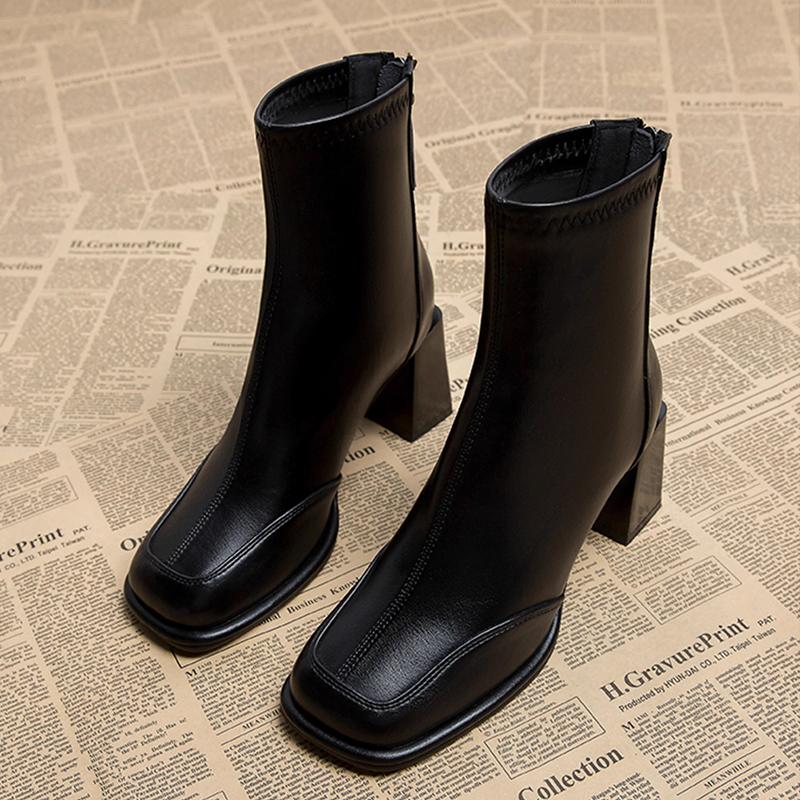Fashion French Retro High Heel Black Ankle Boots Women 2025 Winter Brand Design Square Toe Woman's Chelsea Boots Back Zip Solid Booties cm black