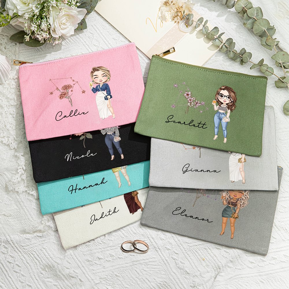Personalisierte Cartoon-Charakter Sternzeichen Geburt Blume Portable Makeup Tasche mit Namen Geburtstag Reisezubehör Geschenk für Frauen