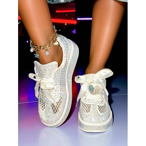 sneakers da donna con strass bianchi, lacci in raso e ciondolo a forma di cuore: scarpe casual glamour per la vita notturna, le discoteche e gli outfit da festa