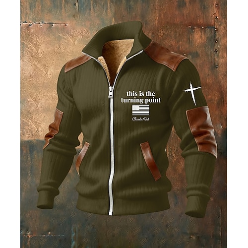 Per uomo Felpa con cappuccio a zip intera Giacca in Pile Felpa con cappuccio in pile Nero Bianco Verde militare Blu marino Marrone Colletto Mao Croce Bandiera Americana Fede Tasca Dettagli in