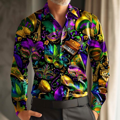 Martedì grasso Per uomo Colorato Carnevale Maschera con piume Camicia Camicia in raso Camicia elegante Manica Lunga Moda Casual Feste Ferie Estate Primavera Collo ripiegato Stampa 3D Camicie con