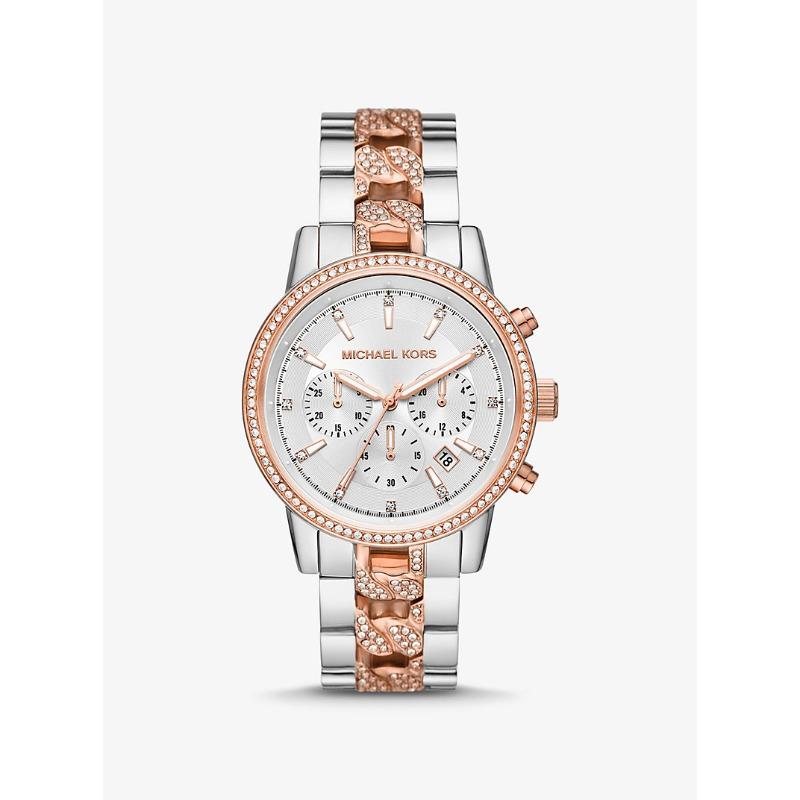 Michael Kors Oversized Bryant Pavé Tweekleurig Curb Link Horloge MK6938 rosé gouden kleur