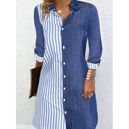 Per donna Mini Abito Abito a Tubino Vacanza Casual Quotidiano Vestibilità regolare A righe Manica Lunga Colletto a Camicia Blu Estate Primavera Autunno