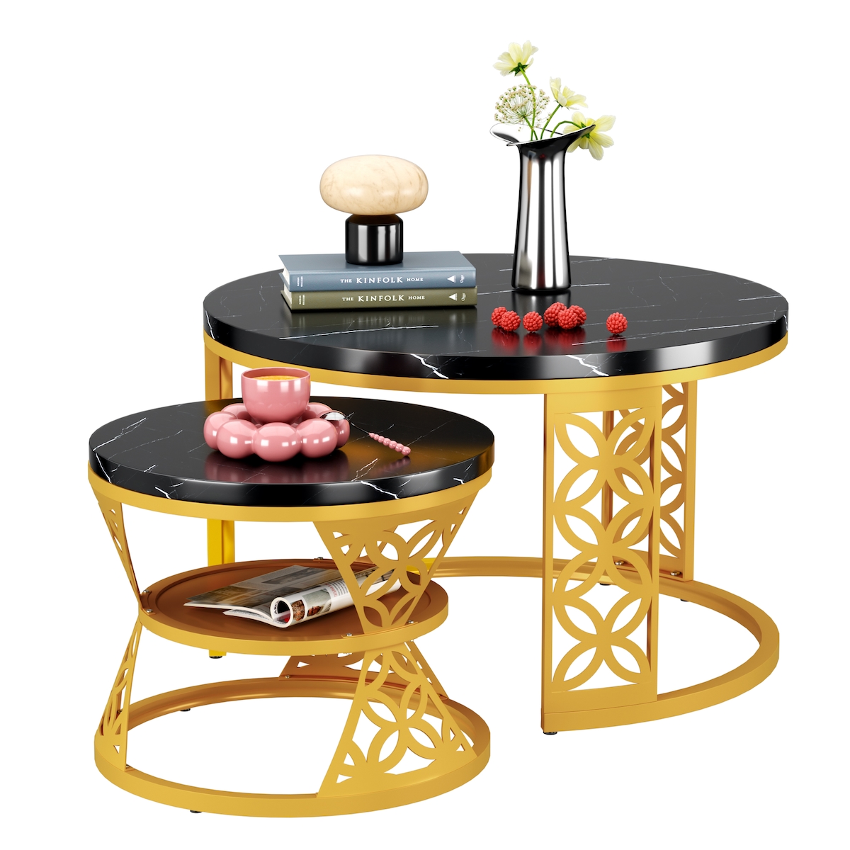 OKWISH 2-teiliges rundes Couchtisch-Set 70x70/45x45 cm mit Metallgestell, Marmorfurnier, Nesting-Design, platzsparend, vielseitig einsetzbar – Weiß+Schwarz