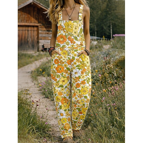 Per donna Salopette Attivo Floreale Senza Maniche Senza maniche Dritto Collo quadrato Tasca con tasca Vacanza Streetwear Vestibilità comoda Bianco Giallo Verde militare Estate