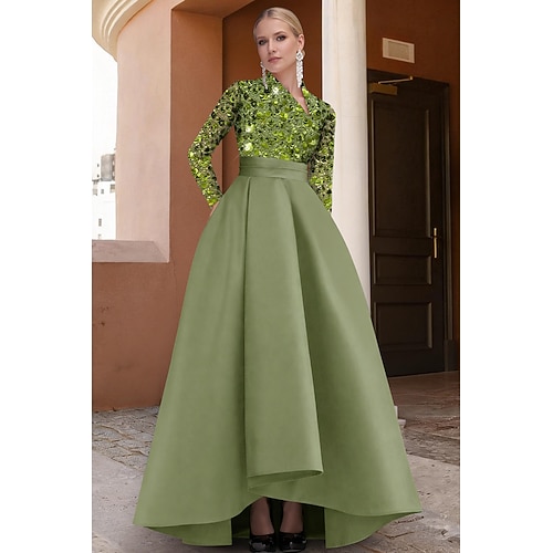 Linea ad A Asimmetrico Abito da Sera Elegante Monocolore Scintillante Manica Lunga Scollo a V Matrimonio Formale Tasca Raso Con Paillettes con Glitter Tasca