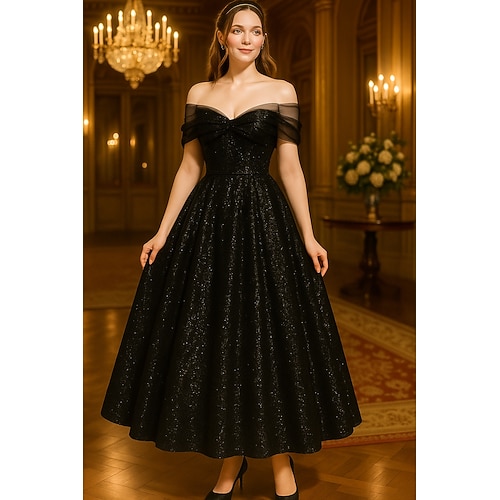 Linea ad A Lunghezza al pavimento Lunghezza Tè Abiti da Cocktail Abiti da festa Elegante Scintillante Manica Corta Senza Spalle Matrimonio Formale Tasca Con Paillettes con Glitter