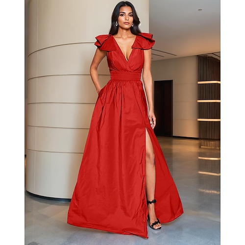 Linea ad A Lunghezza al pavimento Vestito rosa Abito da Sera Elegante Stile Celebrità Setoso Senza Maniche Scollo a V Festa in giardino Matrimonio Taffetà Tessuto Elasticizzato con Fiocco/Fiocchi