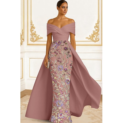 Linea ad A Lunghezza al pavimento Perline ricamate Abito Formale Abito da madre della sposa Abito da Sera Abito da ballo con sopragonna Abito formale Elegante Spacco Alto Manica Corta Senza Spalle