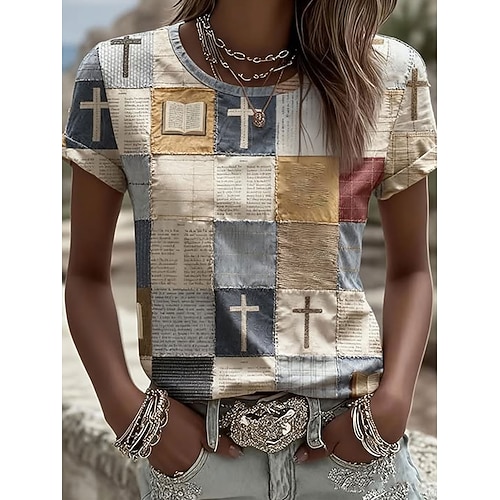 Per donna Maglietta Grafico Geometrico Vintage Elegante Classico Manica Corta Girocollo Top Regolari Quotidiano Weekend Stampato Beige Primavera, Autunno, Inverno, Estate