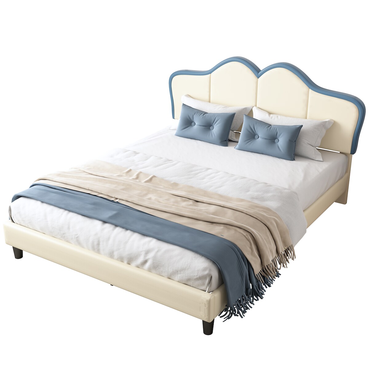 OKWISH Polsterbett 140x200 cm mit Wellen-Kopfteil, Kunstleder Weiß/Blau, Kiefernholz + MDF, inkl. Lattenrost