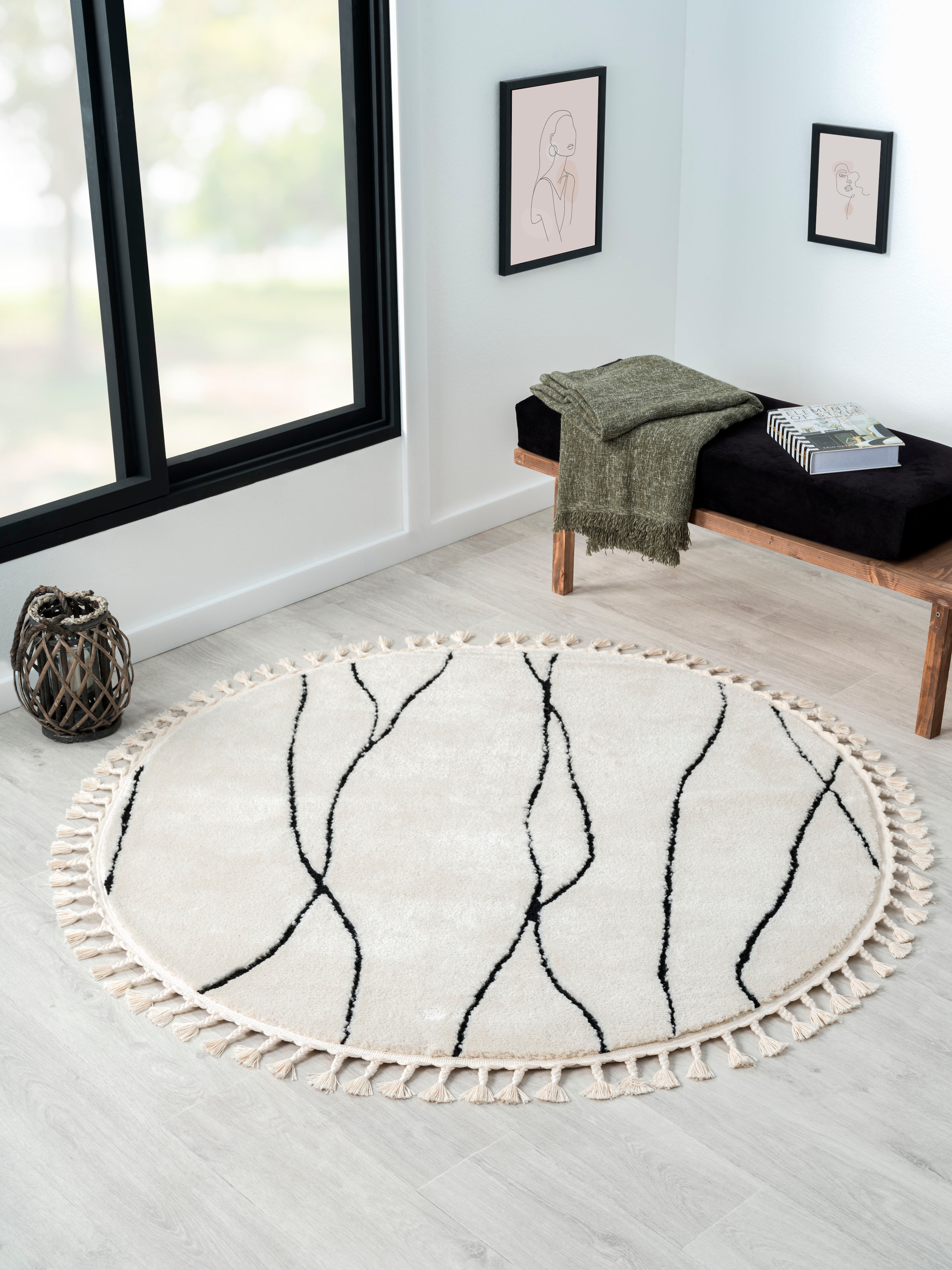 Hochflor-Teppich "Moroccan Pattern", schwarz-weiß (weiß, schwarz), B:200cm H:24mm L:290cm, Polyester, Polypropylen (PP), MYFLAIR MÖBEL & ACCESSOIRES, Teppiche, Fransenteppich, modern, marokkanisches Design, Rauten Muster, weich, mit Fransen