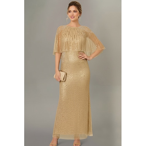 Linea ad A Lunghezza al pavimento Abito con Paillettes Perline ricamate Abito da invitata a nozze Abito da cerimonia per signora Manica Corta Girocollo Elegante Brillare Splendere Formale Con