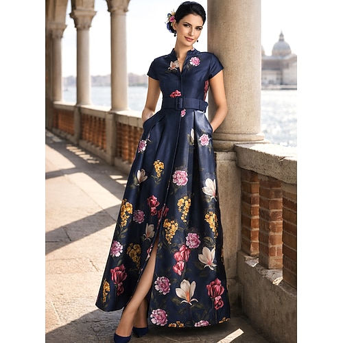 Linea ad A Lunghezza al pavimento Abito da Sera Da principessa Abito formale Elegante Vintage Manica Corta Colletto a Camicia Matrimonio Formale Nylon con Stampa floreale Spacco Tasca