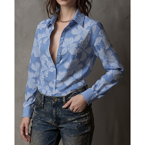 Per donna Camicia Blusa Floreale Elegante Moderno Casual Manica Lunga Colletto a Camicia Top Regolari Quotidiano Ferie Uscire Bottoni Blu Estate Primavera