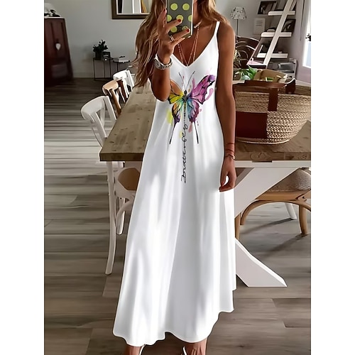 Per donna Abito maxi Vestito Estivo Abito a trapezio Abito Sottoveste Vacanza Casual Boho Spiaggia Vestibilità comoda Grafico Animale Farfalla Senza Maniche Scollo a V Bianco Estate Primavera