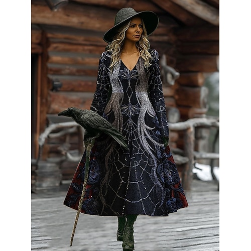 Abito Midi da Donna A Line Abito Vacanza Casual Boho Spiaggia Vestibilità Normale Grafica Astratta Maniche Lunghe V Collo Bianco Rosso Scuro Vino Marrone Primavera Autunno Inverno
