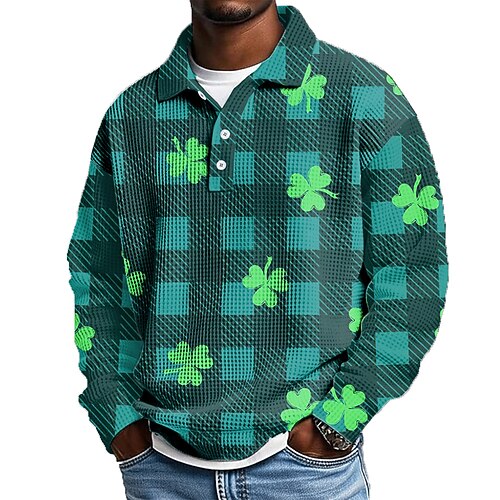 San Patrizio Per uomo Trifoglio Magliette Polo a Nido d'Ape Manica Lunga Magliette polo Bavero Casual Athleisure Abbigliamento quotidiano Abito da festa Stampa 3D Primavera Autunno Verde scuro Verde