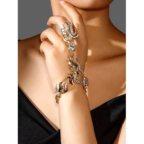 Set di bracciale e anello con catena a mano in strass dorati da donna, gioielli di lusso con design a fiamme di cristallo, perfetti per feste e serate di gala eventi serali