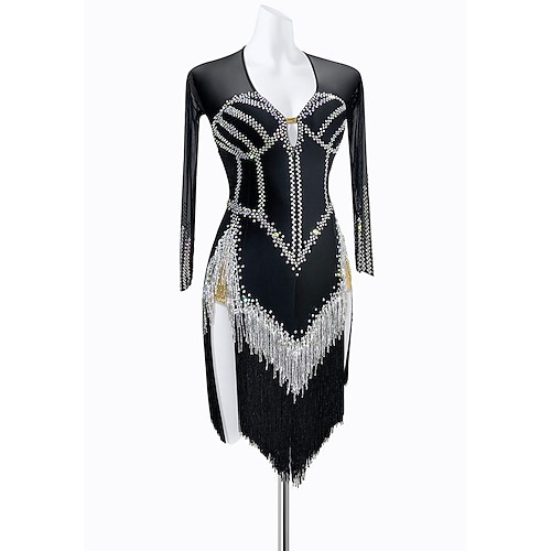 abito da ballo latino nero glamour per donna - manica lunga in rete con scollo a V e decorazioni in strass abito da rumba e salsa con orlo asimmetrico e frange miste