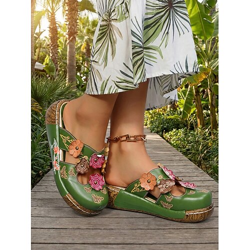 sandali con zoccoli in pelle floreale da donna – muli con zeppa slip-on bohémien fatti a mano con design ritagliato per abbigliamento casual e comfort all'aria aperta