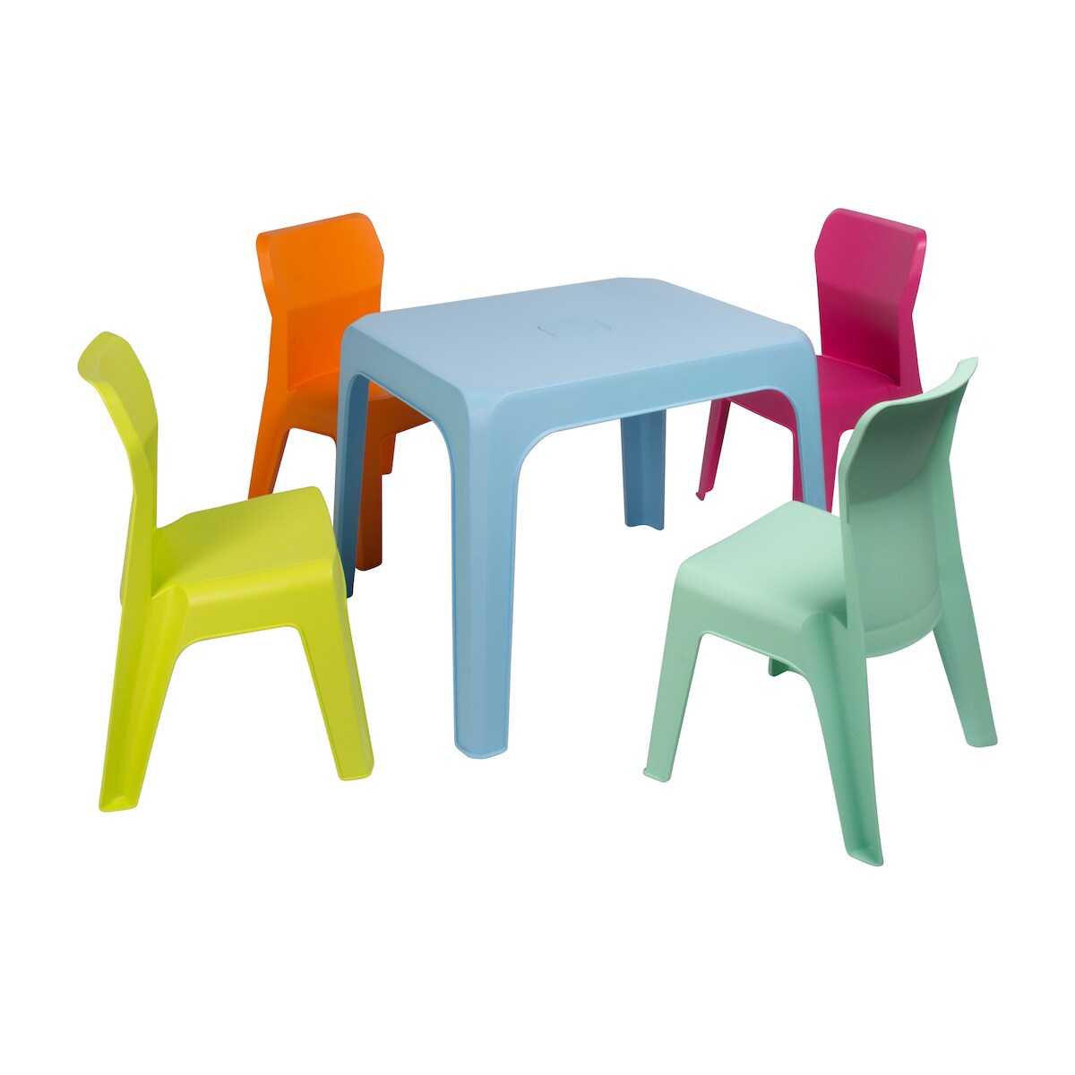 Resol garbar JAN Kinderstuhl-Tisch Indoor, Outdoor Set 4+1 Himmelblau/Fuchsia/Orange/Limettengrün/Aquaminze