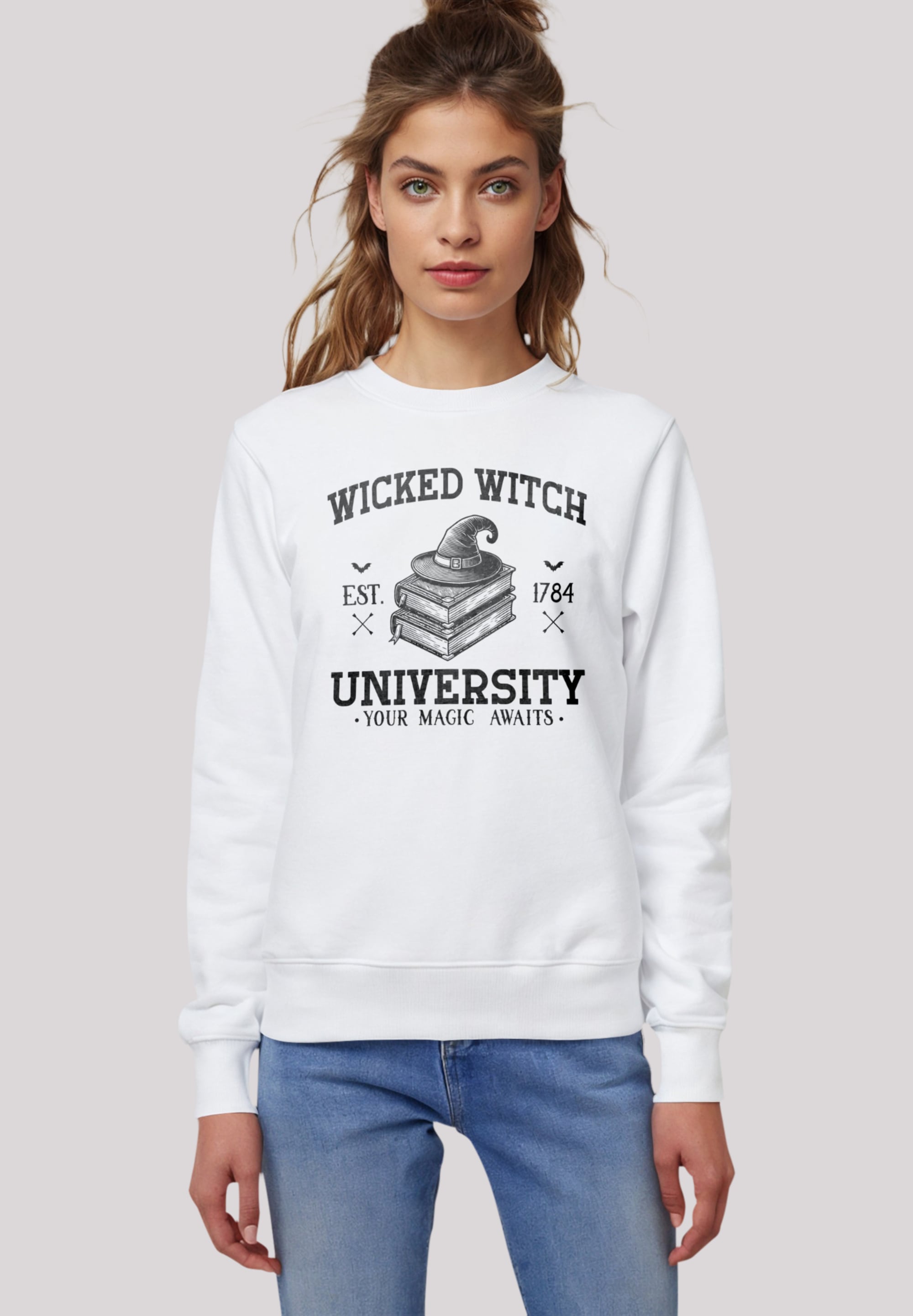 Sweatshirt F4NT4STIC "Halloween University Wicked witch", Damen, Gr. S, weiß, Obermaterial: 85% Baumwolle, 15% Polyester, casual, regular fit, Rundhals, Langarm ohne Bündchen, Sweatshirts, Premium Qualität