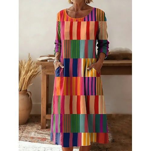 Per donna Abito Midi Tubino Vestito T-Shirt Vacanza Casual Boho Ferie Data Vestibilità regolare Grafico Geometrico Astratto Manica Lunga Girocollo Giallo Rosa Arancione Estate Primavera