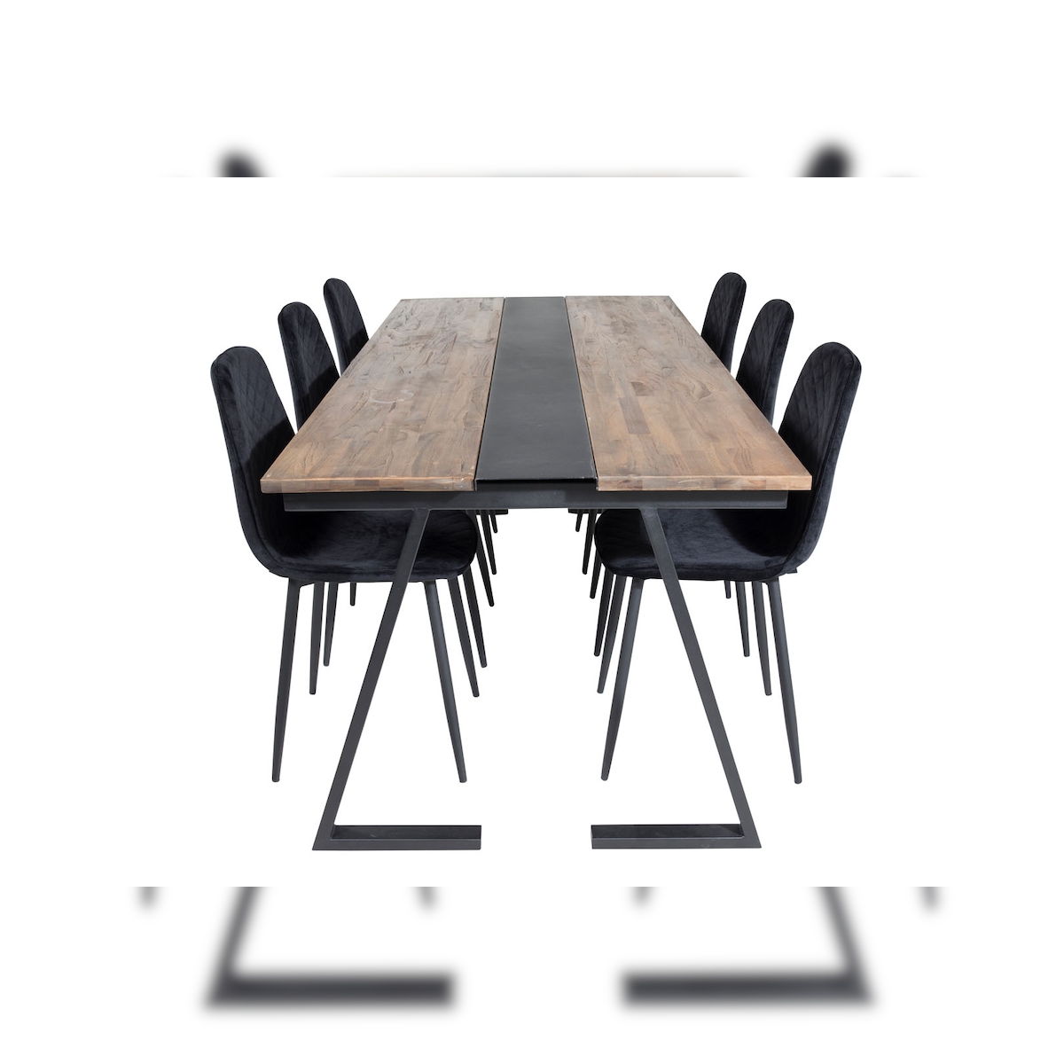 Jakarta Essgruppe Esstisch Teak und 6 Polar Diamond Esszimmerstühle Velour schwarz.