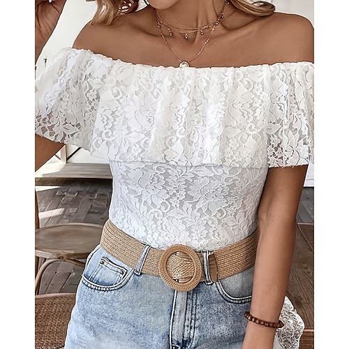 Per donna Blusa Top in pizzo Semplice Elegante Manica Corta Senza Spalle Top Regolari Ferie Uscire Pizzo Bianco Estate Primavera