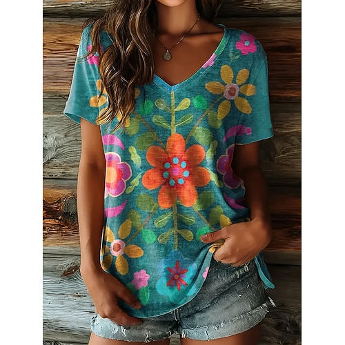 Per donna Maglietta Floreale Grafico Vintage Elegante Casual Manica Corta Scollo a V Top Regolari Quotidiano Stampato Blu Rosa Viola Estate Primavera