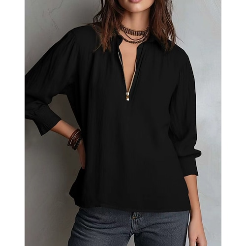 Per donna Camicia Camicie di cotone e lino Blusa Semplice Vintage Elegante Moderno Manica Lunga Scollo a V Top Regolari Quotidiano Ferie Uscire Zip a un quarto Blu Nero Rosso Verde Albicocca Estate