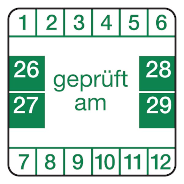 Prüfplakette ab 26, "geprüft am", grün/weiß - Bogen = 10 Plaketten - 30 x 30 mm Folie selbstklebend