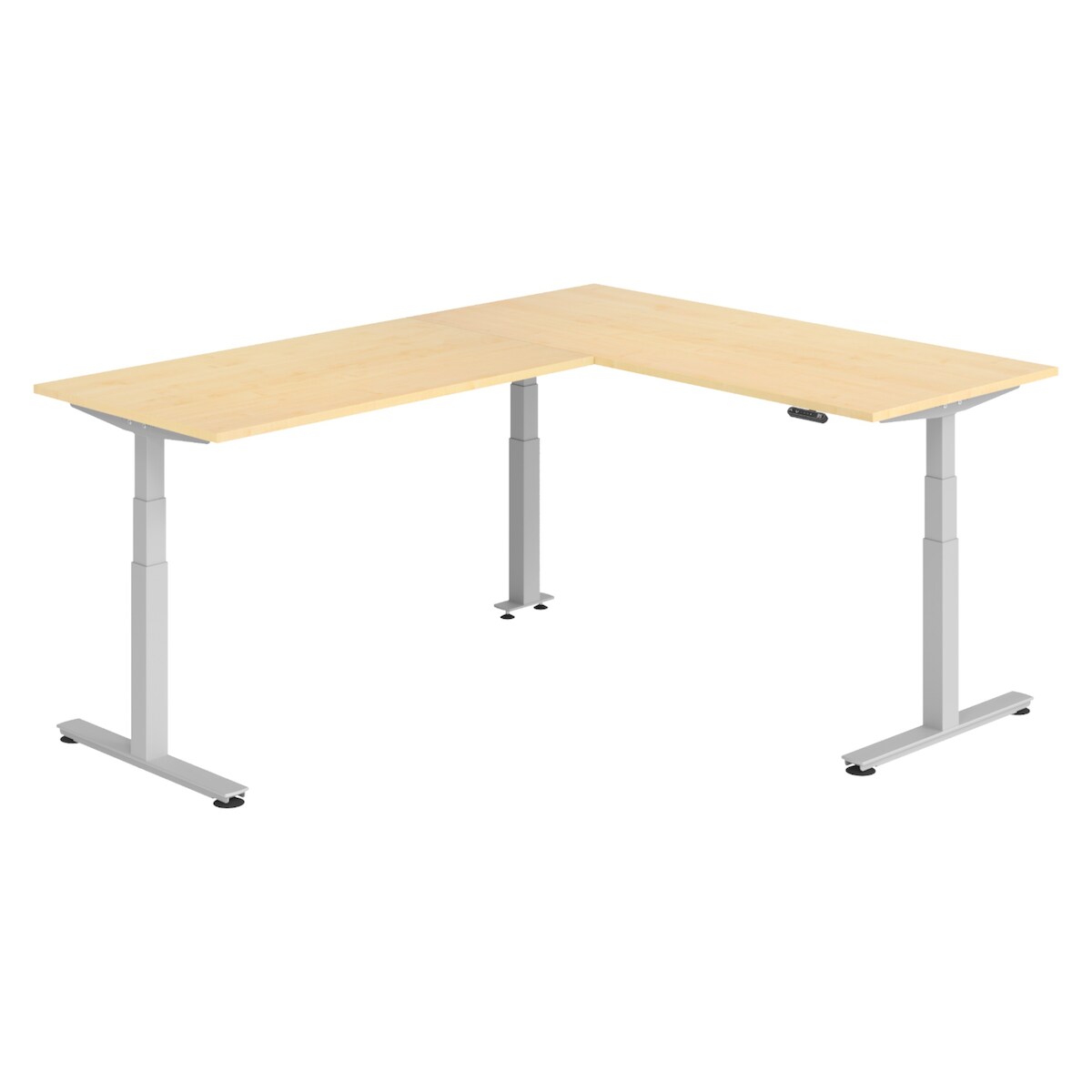 bümö Eckschreibtisch elektrisch höhenverstellbar L-Form: 180 x 240 cm in Ahorn, Gestell silber - Stehschreibtisch mit Memory-Steuerung, elektrischer
