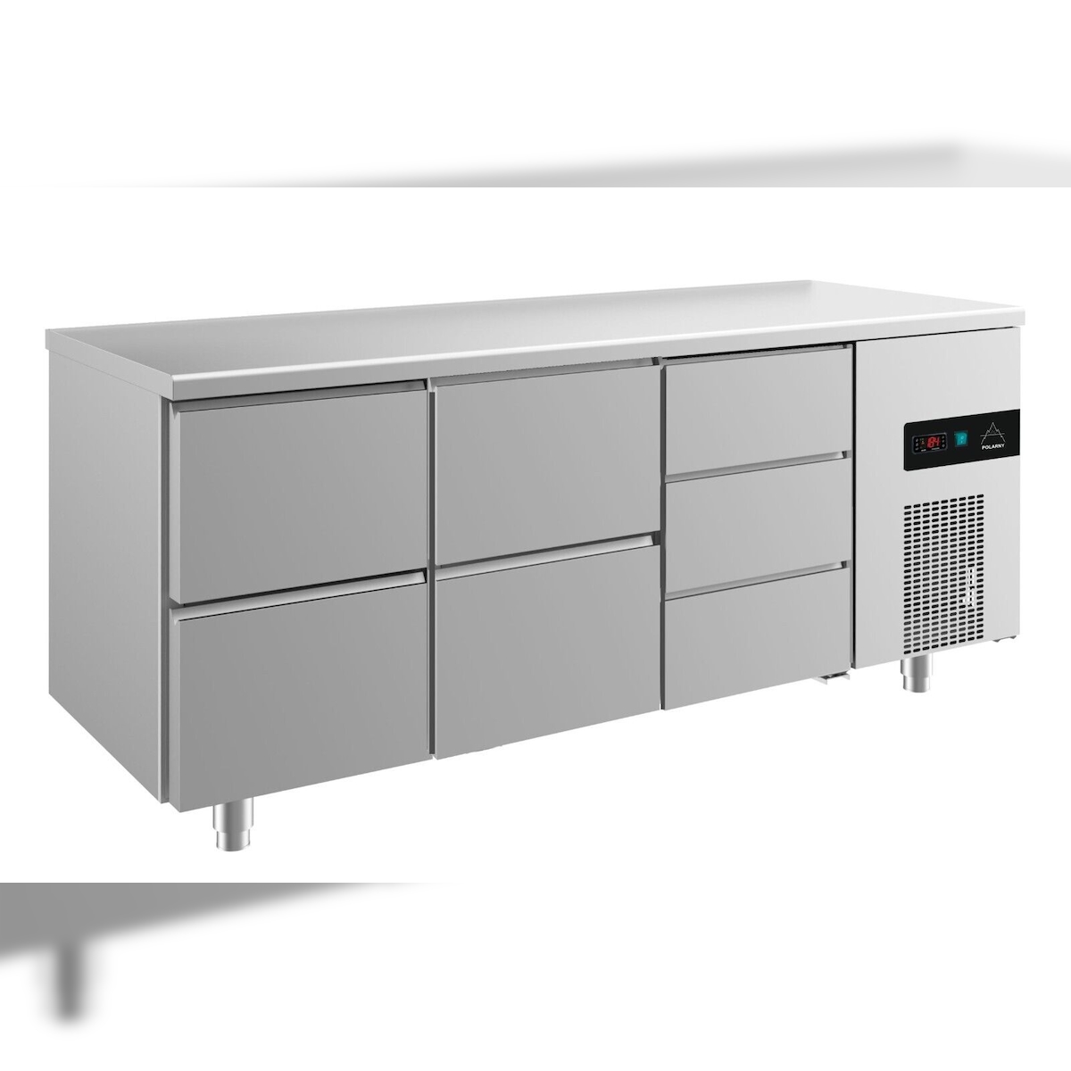 A&S polarny Gastro Kühltisch 2 Türen links&mittig je 3 Schubladen mittig&rechts Umluftkühlung Aufkantung, 2330x700x850mm -2/+8°C 632l
